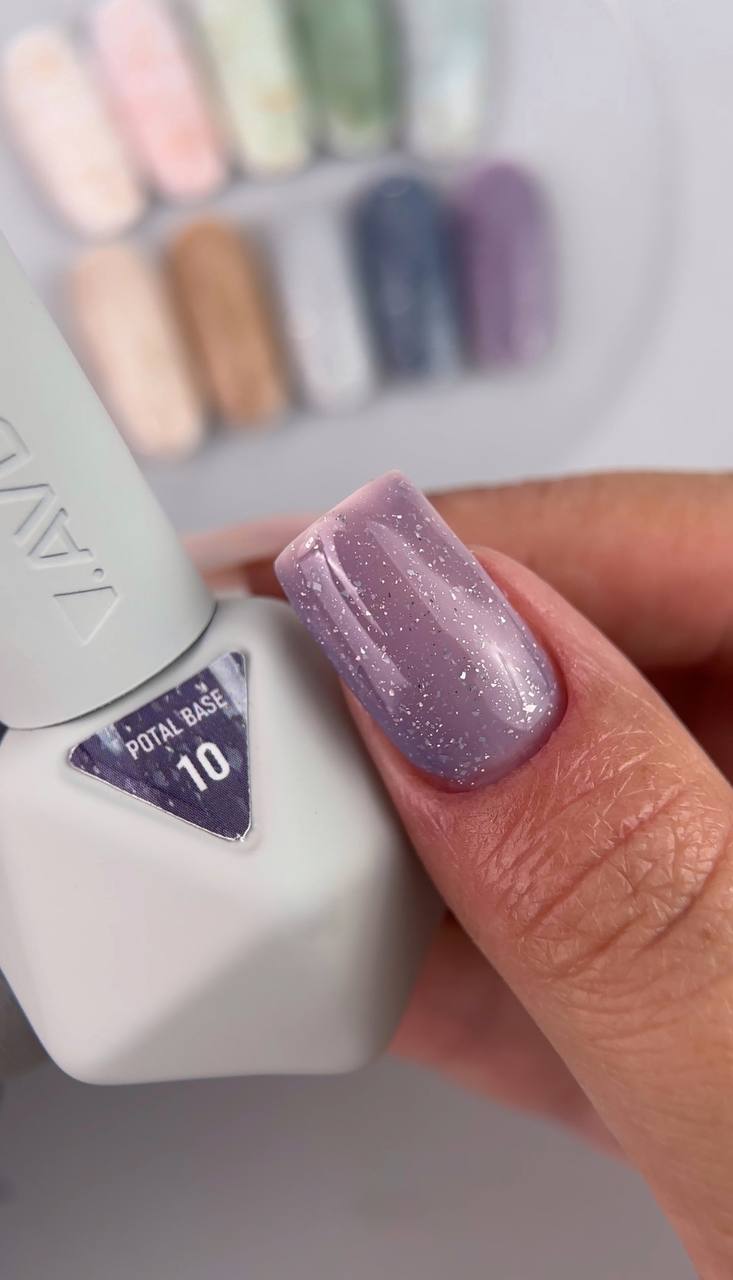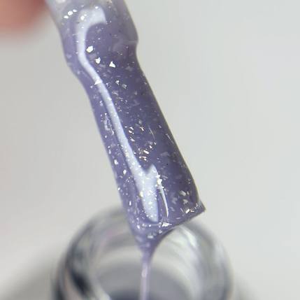 Камуфлююча база для нігтів з ніжним лавандовим відтінком і сяючими срібними вкрапленнями.