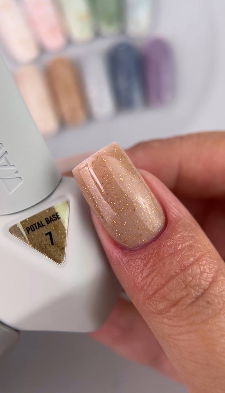 POTAL BASE – ідеальне рішення для витонченого, елегантного манікюру. Завдяки природному нюдовому кольору з теплим підтоном і золотими вкрапленнями база створює вишуканий ефект. Вона самовирівнюється, зміцнює нігті та забезпечує стійке покриття до 4 тижнів.